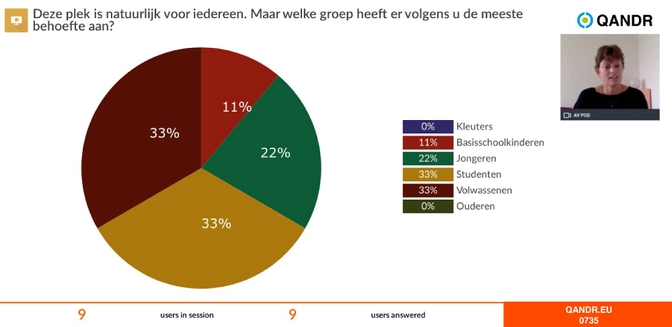 Various other modules in QANDR’s interactive toolbox were used as well to allow residents to share their points of view on the various aspects. Such as the dilemma (participants move their dot to position their opinion), poll (multiple choice question), wordcloud (brainstorm with key words) and grading (grade a concept) modules. Responses and visualized opinions were the starting point for further discussion in the group. All in all useful information for the municipality, and for resident a hands-on experience that generated a real sense of involvement in and joint ownership of the intended development. See below for samples (in Dutch).