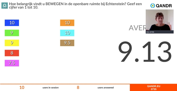 In an online meeting, Judith Iddekinge, project manager for the ‘E-district’, discussed the plans with local residents and queried them on their wishes and ideas. ClickMeeting was the communication tool of choice, and QANDR allowed residents to use their phones to intuitively express their opinions on the various topics. For example, they had been asked beforehand to make or find photos to represent their ideal picture of the redeveloped public space. During the meeting they were able to submit these photos to a QANDR moodboard on the central screen.
