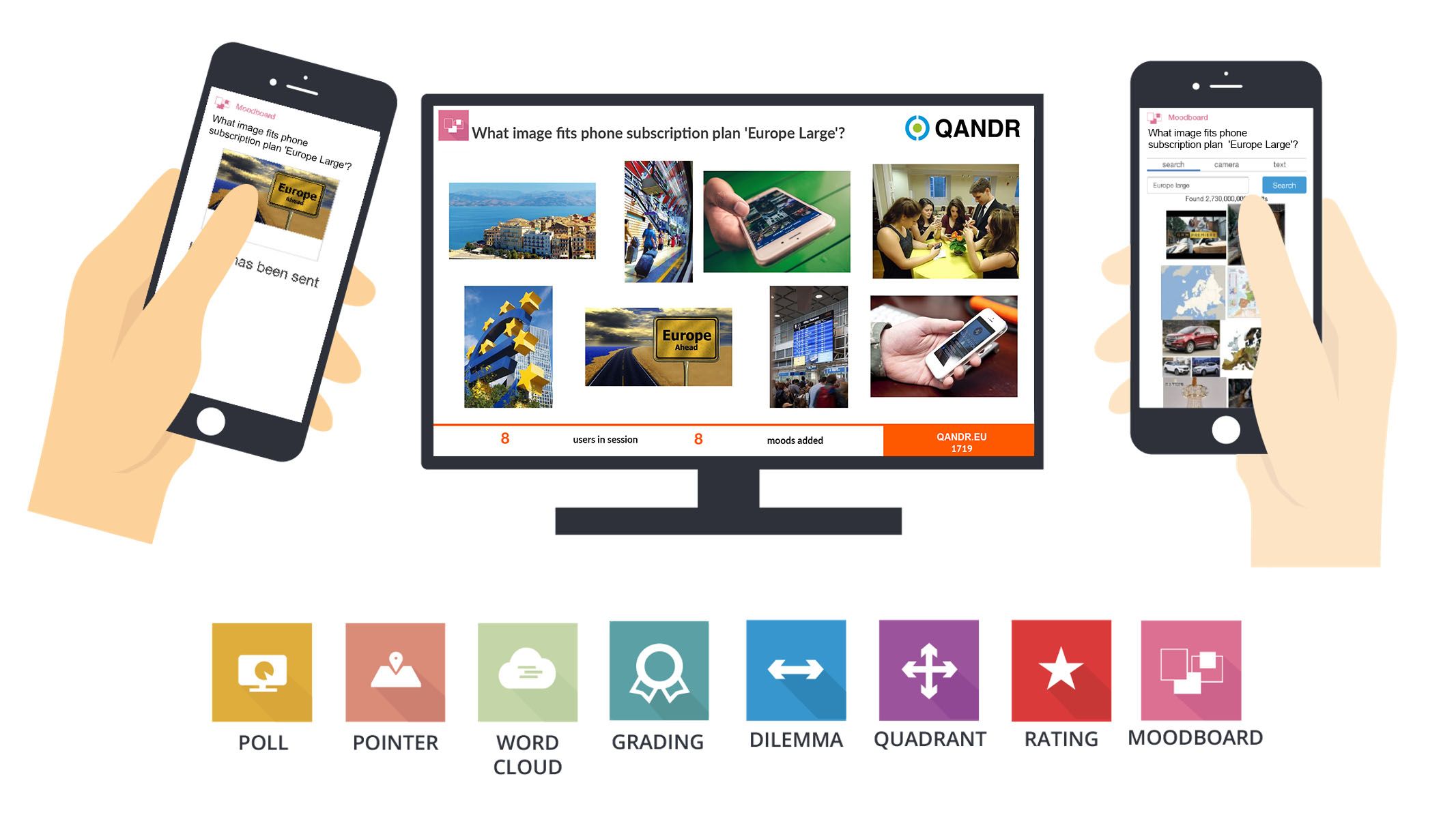 Normally we ask participants in a group discussion to switch off their cell phones, but not now! With QANDR they actively use their phones to add visual elements to a large screen in the room, and reflect on these elements during the discussion. This makes the group discussion more fun for your participants as well as your client, but above all it provides enriching input. With QANDR even the most abstract topics can be discussed in a quick, clear and nuanced fashion.